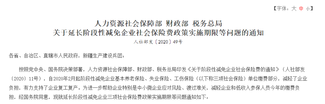 人力資源社會保障部 財政部 稅務(wù)總局關(guān)于延長階段性減免企業(yè)社會保險費政策實施期限等問題的通知人社部發(fā)〔2020〕49號各省、自治區(qū)、直轄市人民政府,新疆生產(chǎn)建設(shè)兵團: